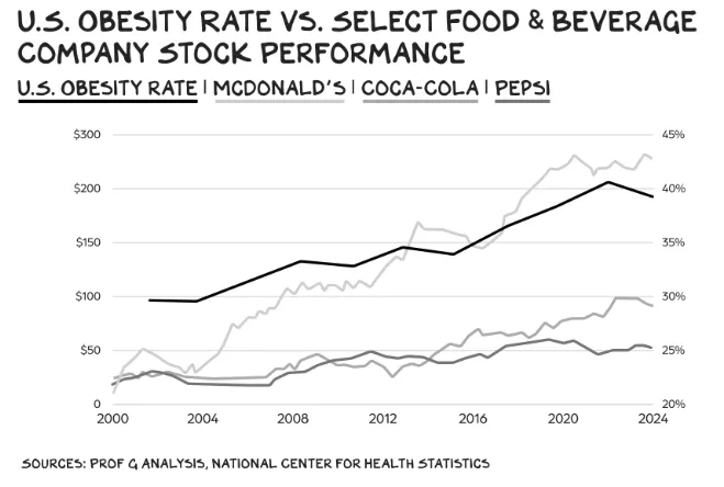 Taken from Scott Galloway’s newsletter about GLP-1’s. Showing the uncanny relationship between obesity rates and food and beverage company performance.
