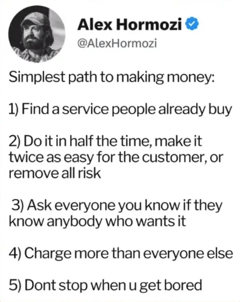 Captain Hormozi on how to make money. Too many 22 year old kids in SF think they need to be the next Elon Musk to make up for them being bullied in high school. When really all you need to do is just this. ✍🏻✍🏻